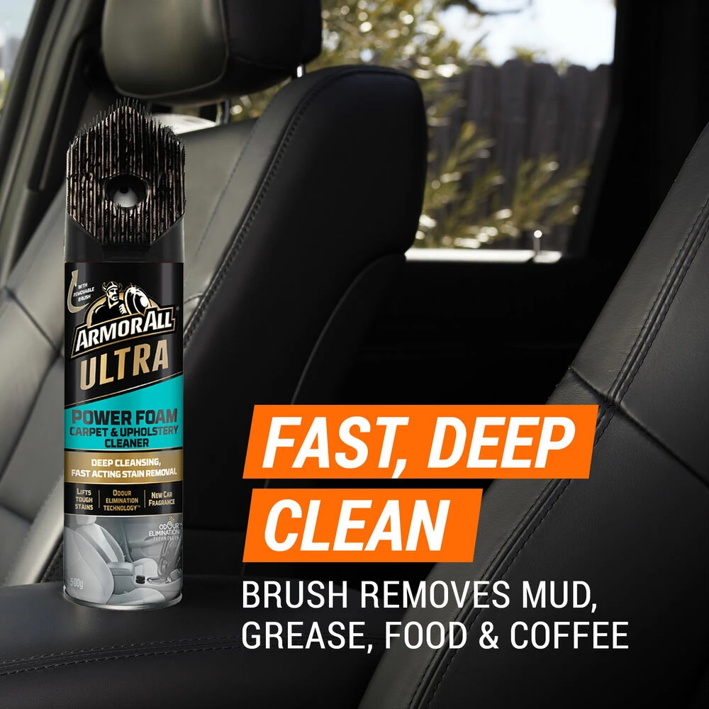 Spills and messes in your car can leave lasting stains and smell, making your interior an unpleasant place to be. Armor Alls new Ultra Carpet & Upholstery Cleaner is designed to be their strongest defence against messes from food, mud, dirt, pets and more. With Odour Elimination Technology this foaming cleaner destroys the source of the odours, and with help from the detachable brush can remove them from deep fabrics and carpets.