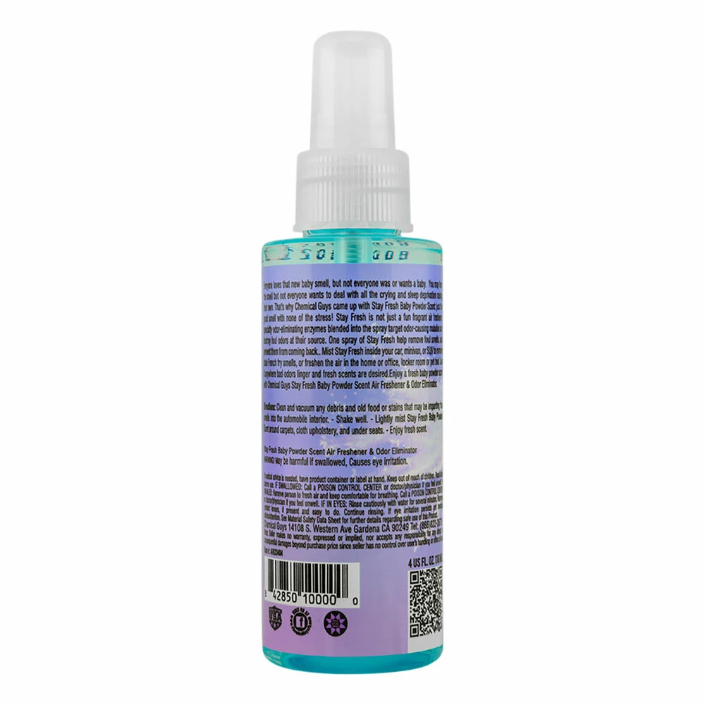 Odor-Destroying Formula: Stay Fresh is not just a fun fragrant air freshener: specialty odor-eliminating enzymes blended into the spray target odor-causing maladies and destroy foul odors at their source. One spray of Stay Fresh can remove foul smells, and prevent them from coming back to any enclosed space. Enjoy the fresh and clean scent of talcum powder without any of the mess or responsibility, thanks to Stay Fresh!